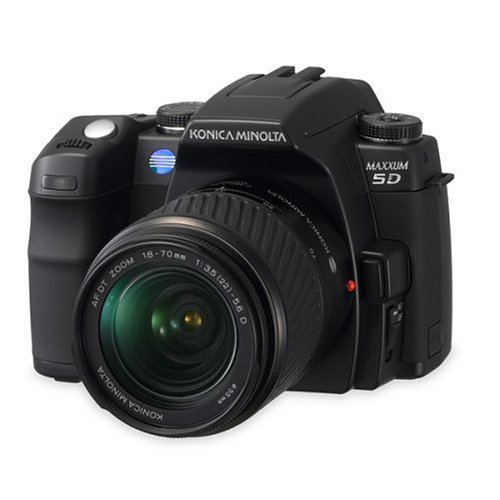 Maxxum 5D offers a user-friendly configuration of dials and controls that even beginner SLR camera users will quickly feel familiar with. Added functions provide users who are moving up from more basic models with intuitive control; the exposure mode dial also operates the five options of the Digital Subject Program Selector, and an independent lever ensures quick and easy white balance control. Electronic menus display adjustable parameters to meet the demands of advanced photographers, and a menu call button simplifies menu navigation. Enhances ease of use so users can navigate intuitively without having to refer the instructions. Digital Effect Control lets users select an option among ten scene types, edit the parameters to their preferences, and then store the settings. Once a scene is selected, the Konica Minolta Maxxum 5D automatically sets appropriate image processing and image quality parameters In addition to AWB (auto white balance), PWB (preset white balance), custom white balance and color temperature settings, the Maxxum 5D offers added creative freedom with CC (Color Compensation) filter effects and Color Temperature fine-tuning in 100K increments High-performance, high-speed autofocus (AF) Capture up to 30 frames at a speed of approximately 3 frames per second (in Fine JPEG mode) Image Recording Media - Type I and Type II CompactFlash Cards, Microdrive // SD Memory Card, MultiMediaCard require optional SD-CF1 Auto and manual exposure modes Built-in electronic-flash Video Output PAL / NTSC (selected on the camera) USB Uses and included Minolta NP400 rechargeable battery Dimensions (WxHxD) Approximately 5.1 x 3.6 x 2.6 in / Weighs - 20.8 ounce